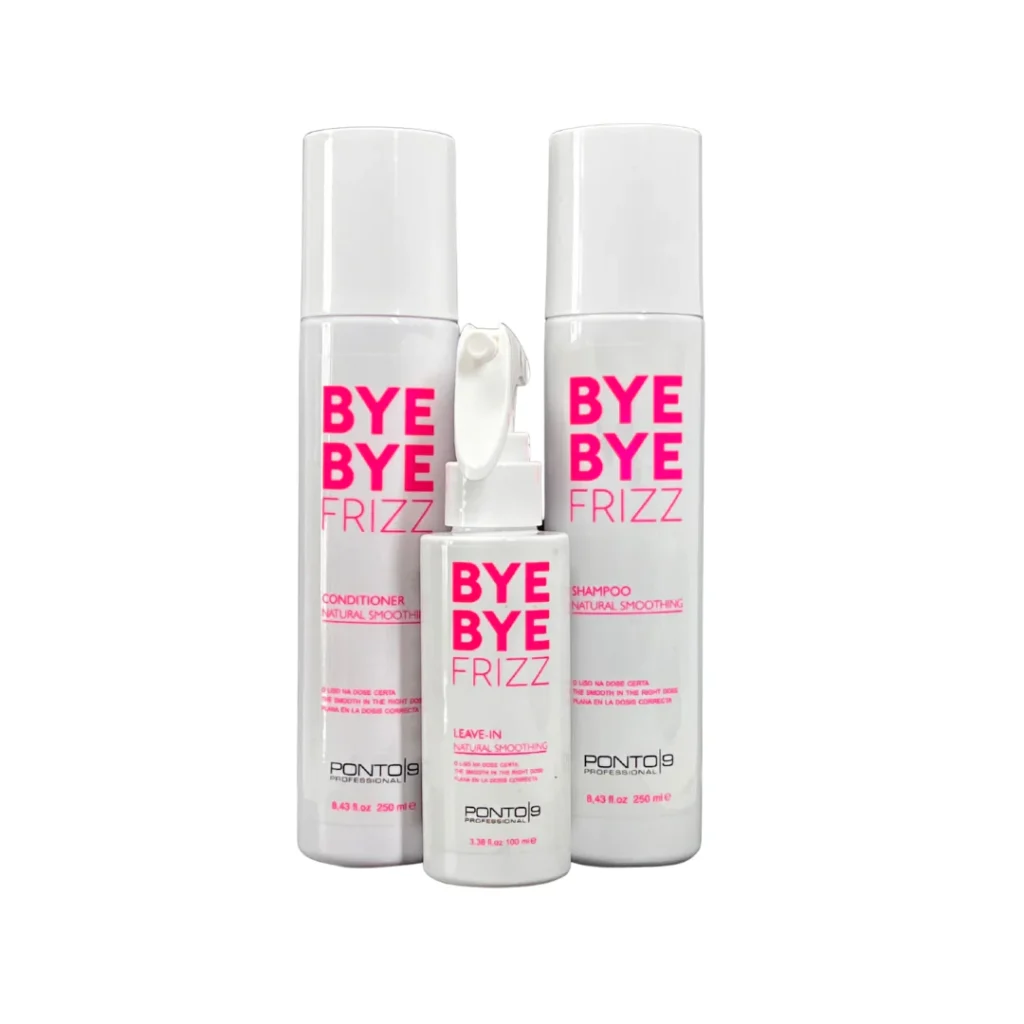 El kit completo contiene champú, acondicionador de 8.45 oz y crema para peinar (leave-in) de 33.80 oz. El Sistema Bye Bye Frizz de Ponto9 uno de los mejores tratamientos para el cabello es su fórmula profesional de alta tecnología que combina nanopartículas, aceites naturales y activos termoactivos